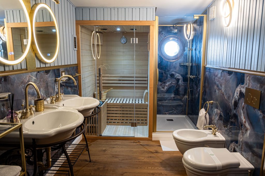 un’area benessere privata con sauna e doccia walk-in, per vivere il lago nel modo più elegante e rilassante.