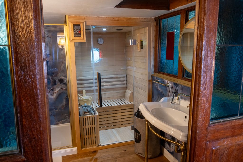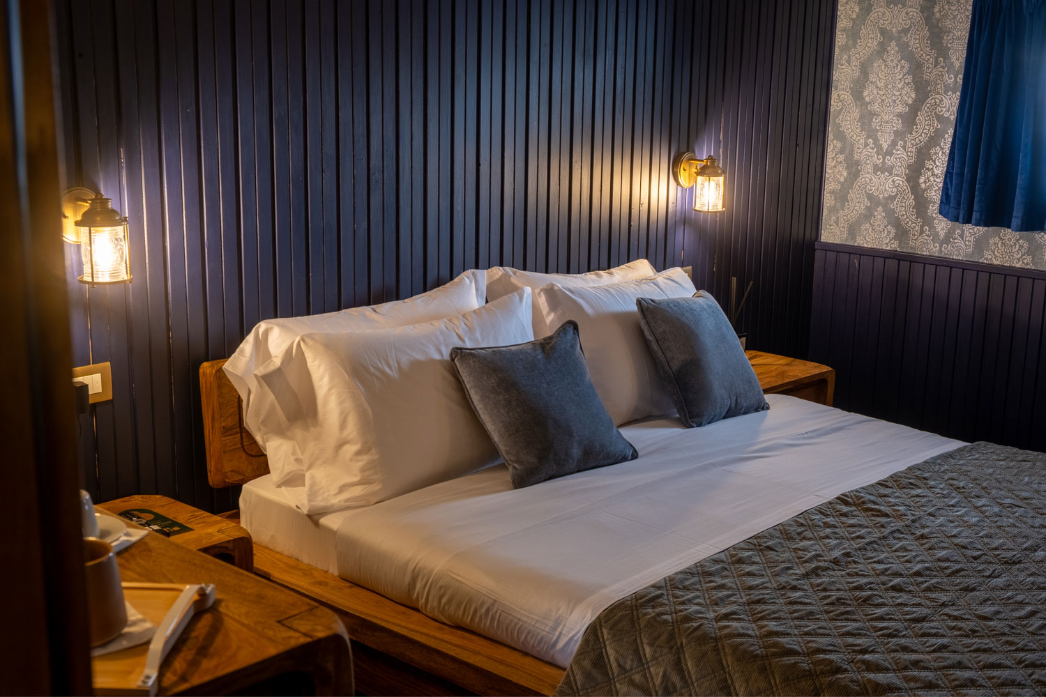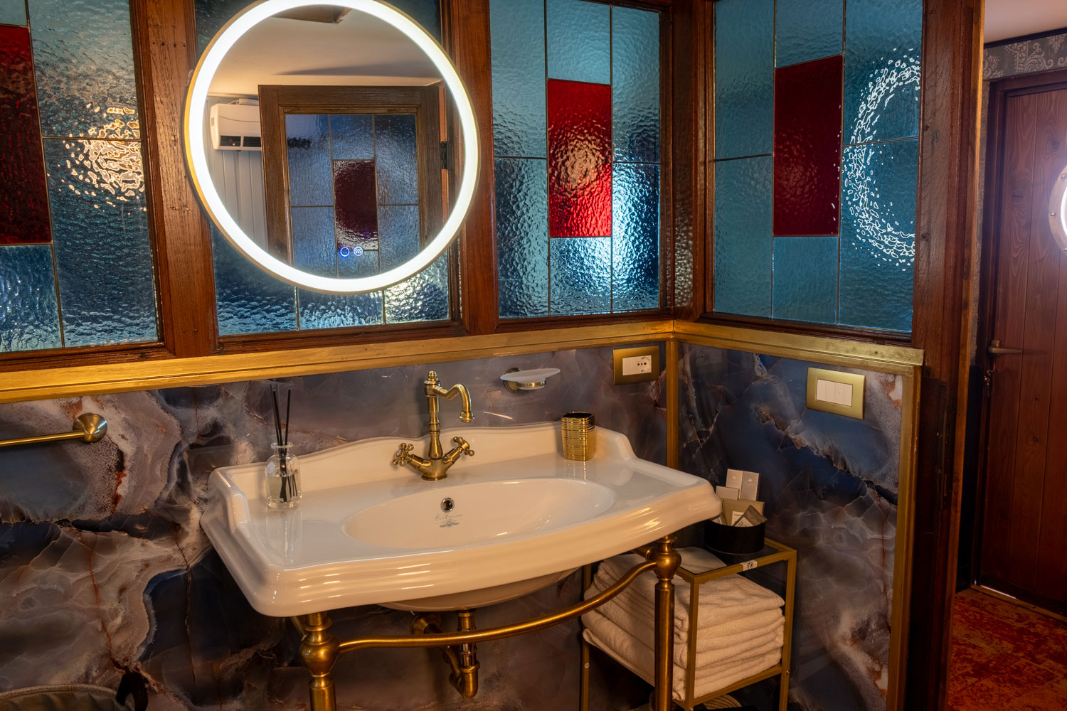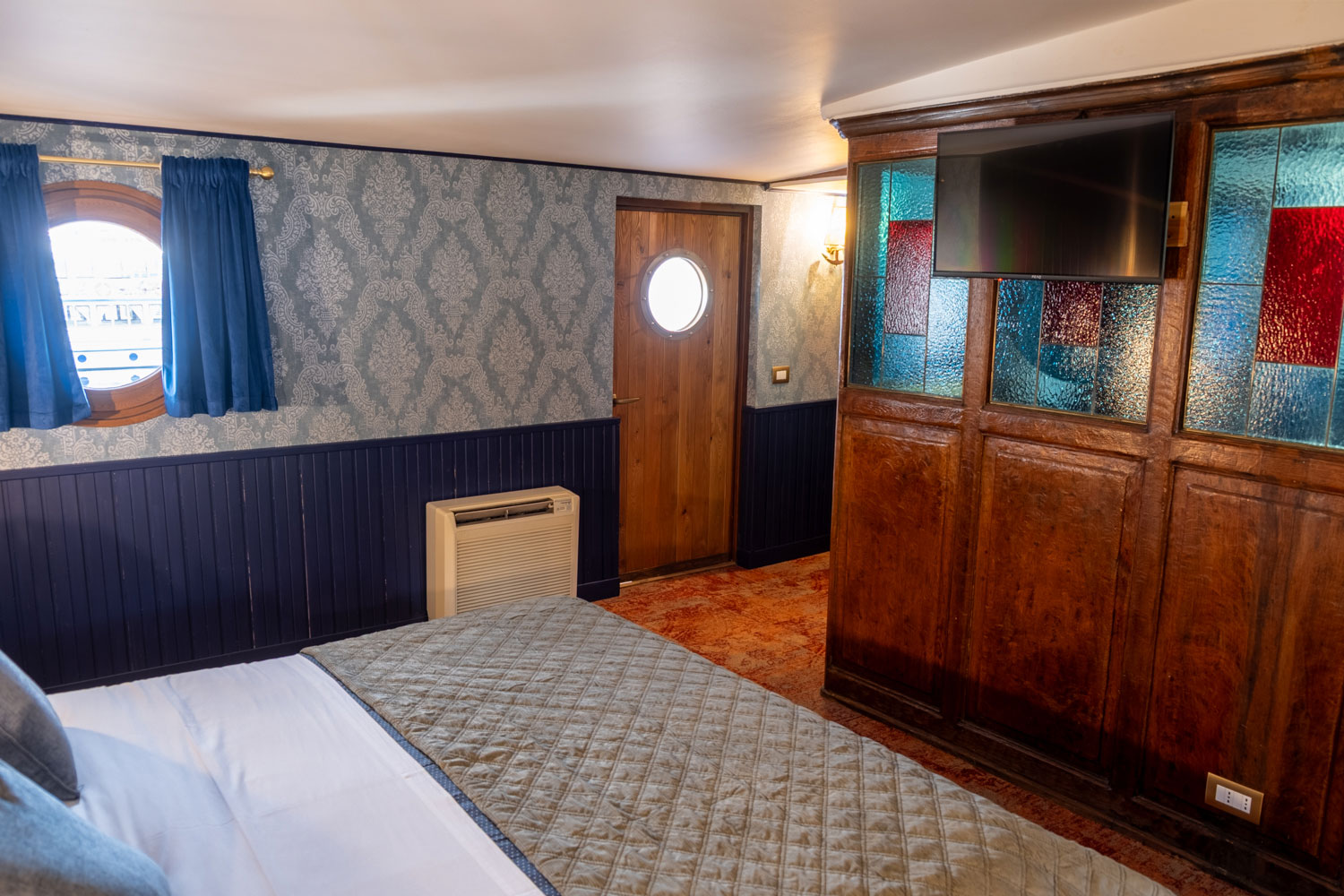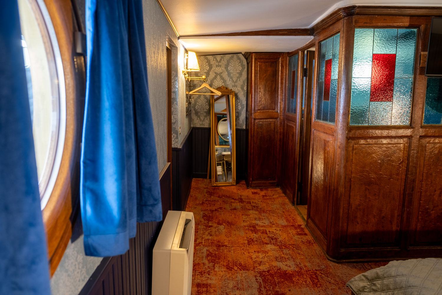 La Regina Madre è una camera spaziosa e accogliente, pensata per offrire un soggiorno immerso nella storia del Piroscafo Lombardia. Il suo elemento più suggestivo è il bagno ricavato all’interno della vera cabina del capitano, rimasta intatta nel tempo: un luogo che un tempo ospitava la scala per raggiungere i comandi di bordo e che oggi accoglie un bagno moderno con sauna privata e doccia walk-in, in un perfetto equilibrio tra passato e comfort contemporaneo.